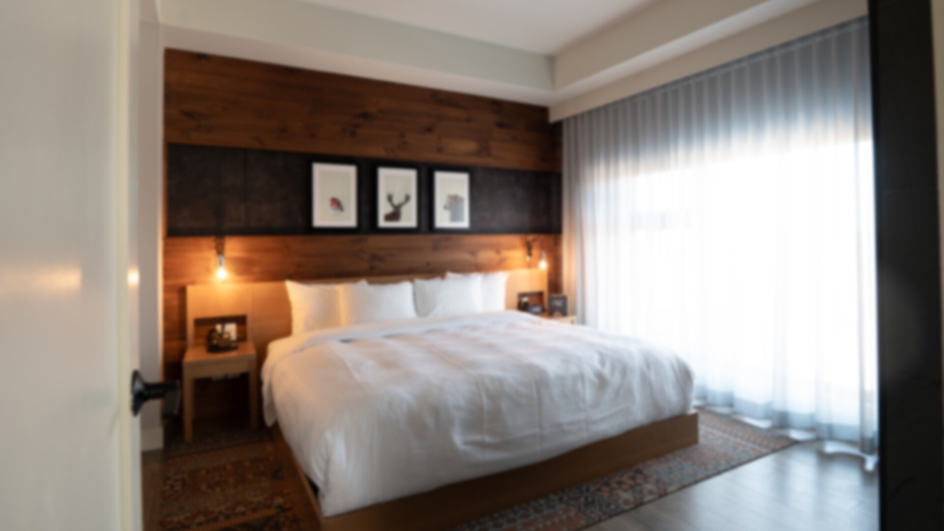 Petite chambre moderne avec grand lit. Contient un bureau, une salle de bain complète et une fenestration offrant une belle lumière naturelle.