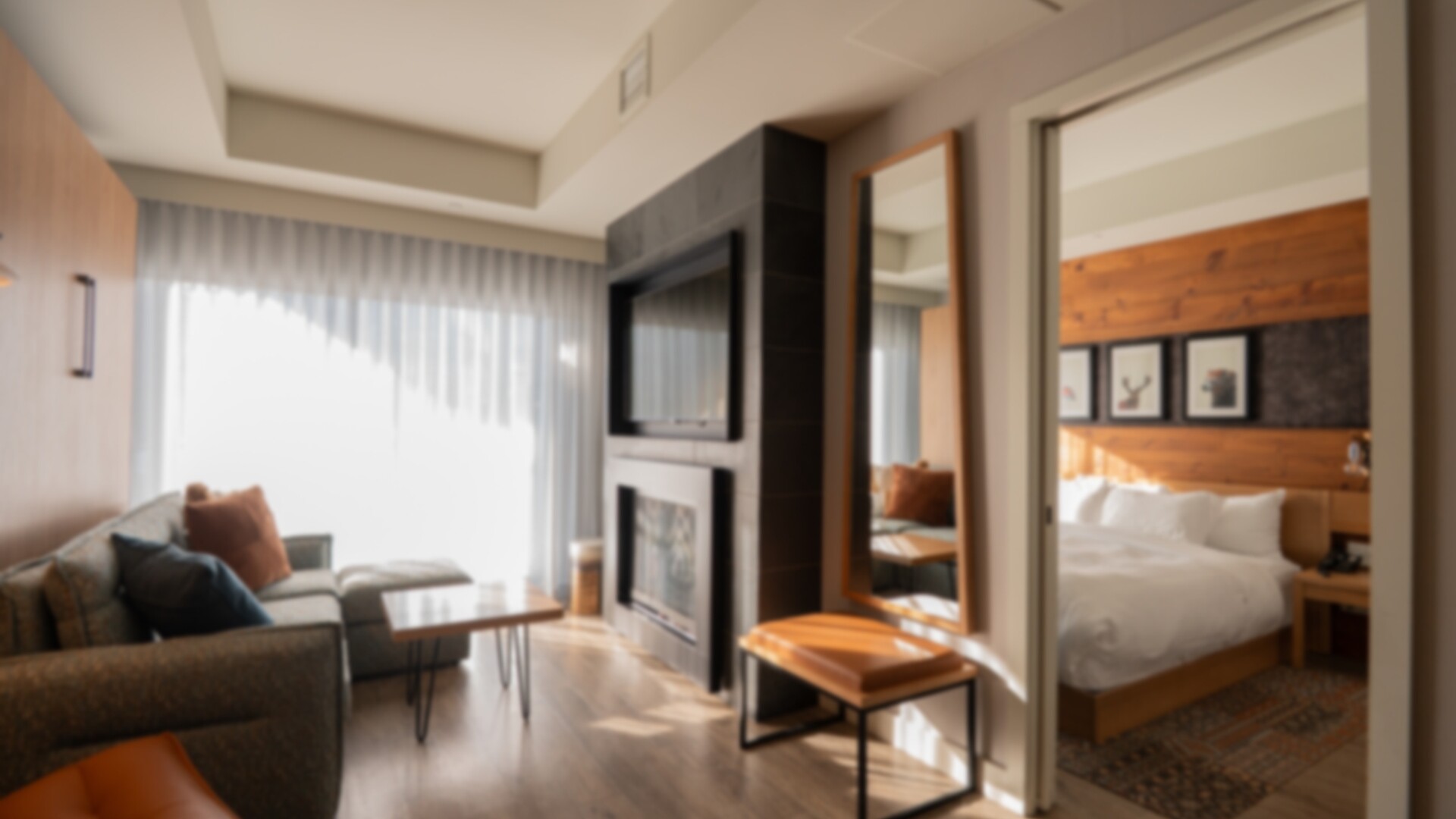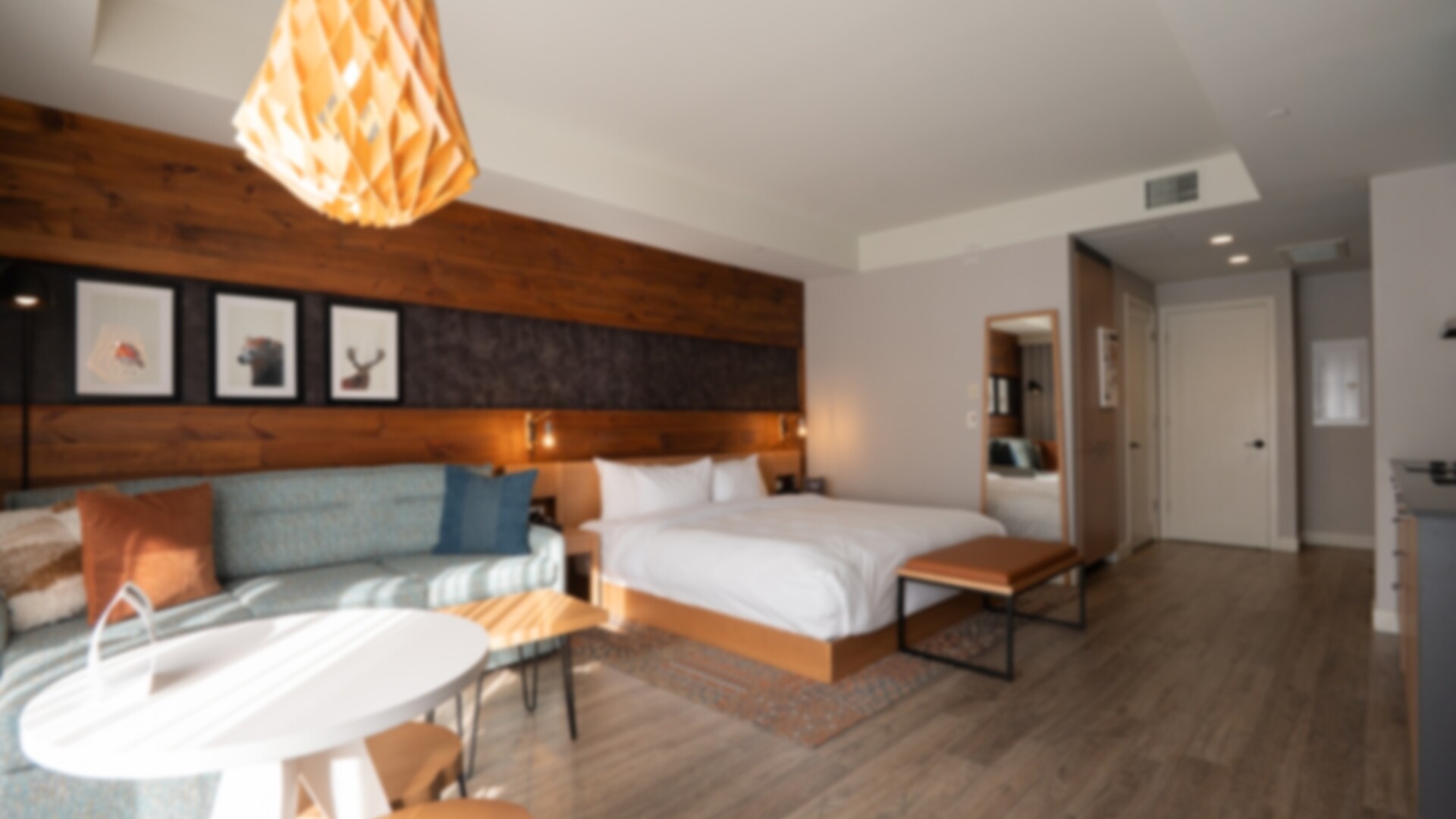 Chambre comportant un très grand lit, un divan sectionnel, une cuisinette, une terrasse ou un balcon et une salle de bain complète.