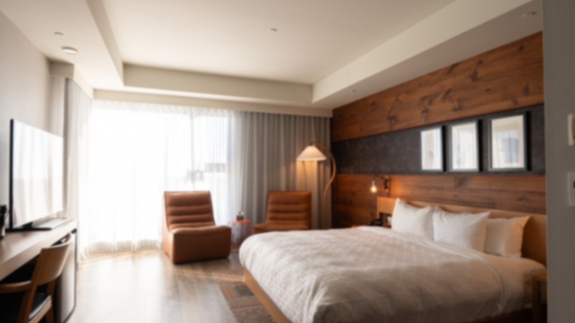 Chambre moderne spacieuse avec un grand lit ou très grand lit. Contient un espace de bureau et une salle de bain complète.