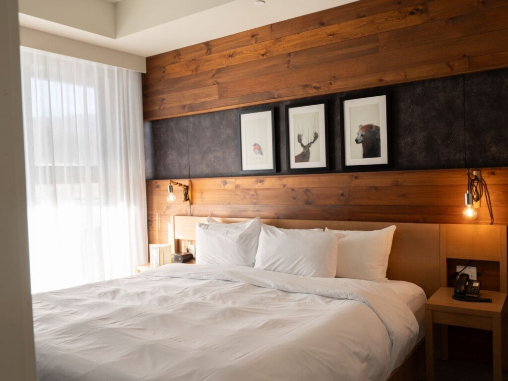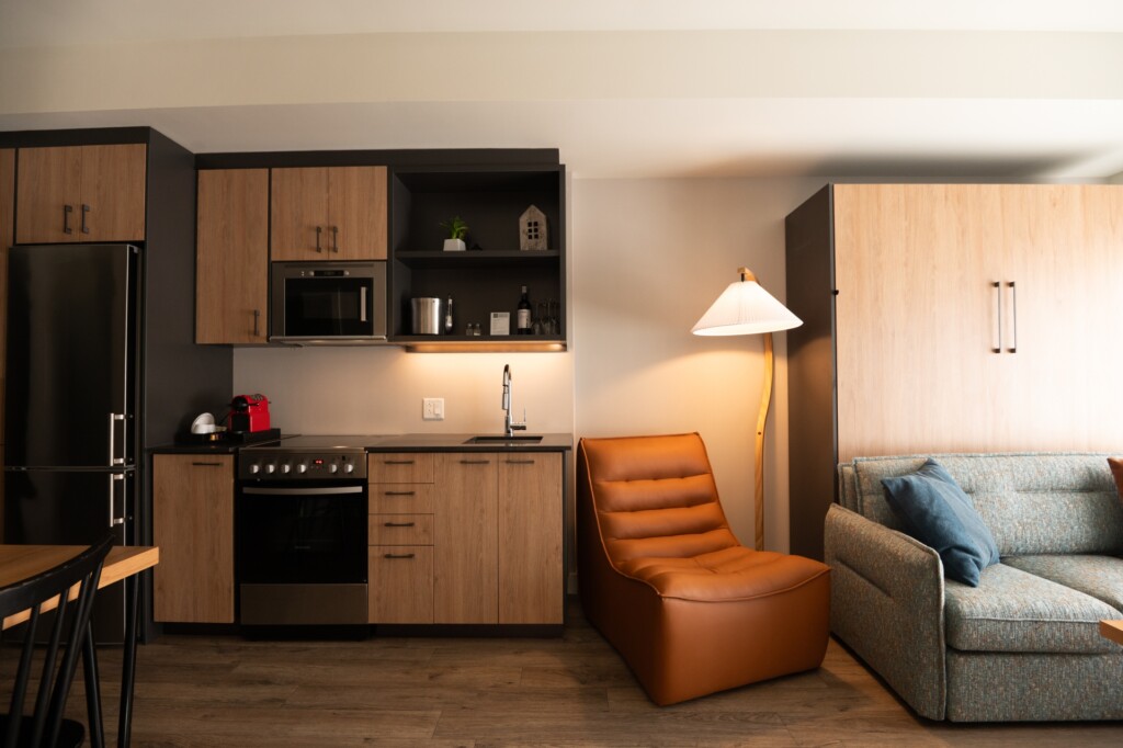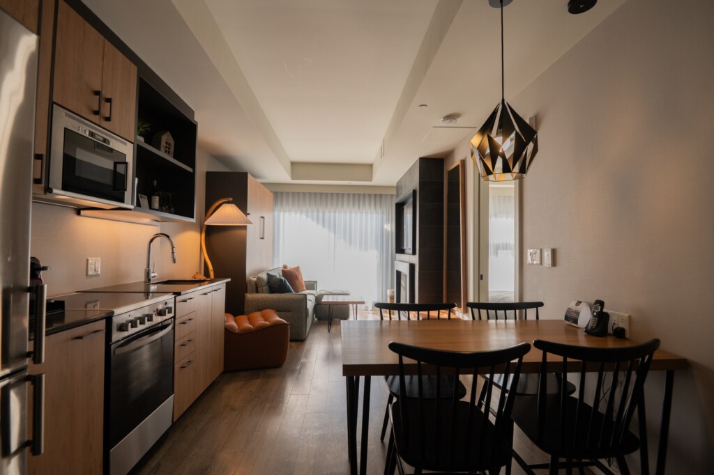 Cette suite offre une chambre fermée avec un très grand lit et une cuisine complète avec table de salle à manger et couverts pour quatre personnes. Elle dispose d’une salle de bain complète avec douche vitrée et lavabo double. Dans le vestibule d’entrée, il y a une laveuse-sécheuse à votre disposition et un foyer d’ambiance au gaz. Votre balcon ou terrasse vous donnera l’option d’apprécier l’air pur de la montagne ou de la superbe vue du boisé. Il est possible de jumeler une suite urbaine ainsi qu’un loft afin d’avoir une très grande chambre communicante.
