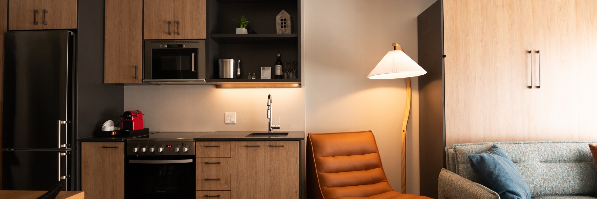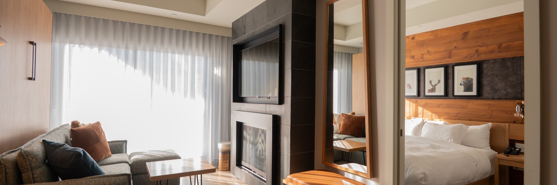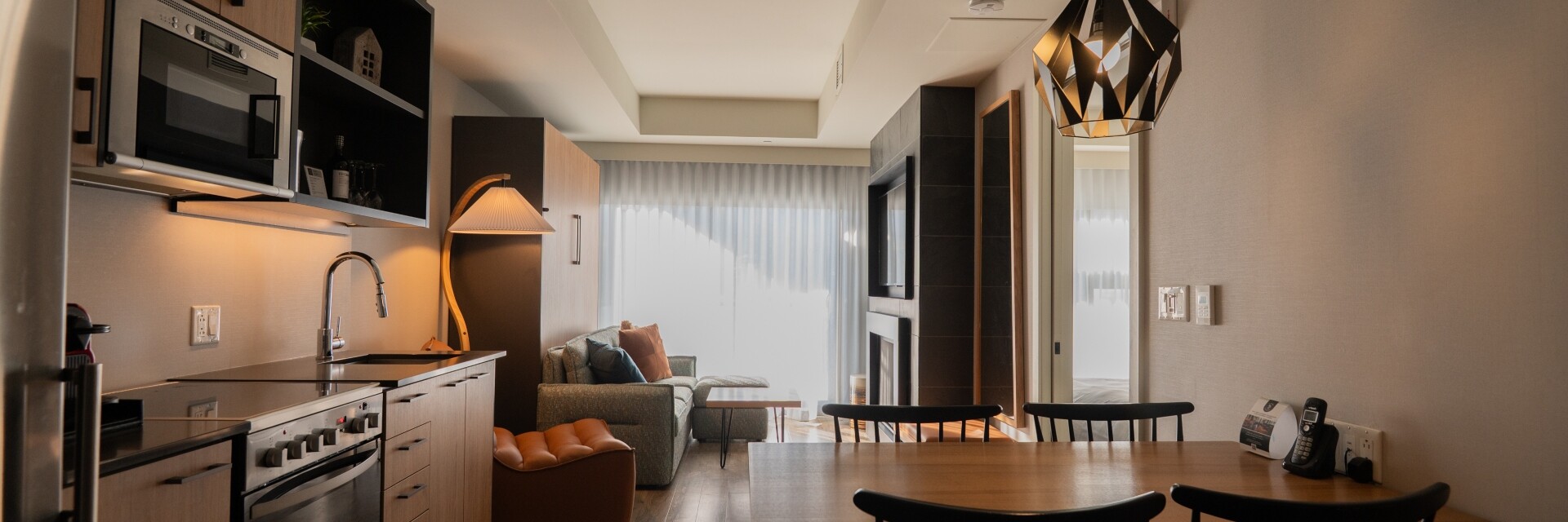 Cette suite offre une chambre fermée avec un très grand lit et une cuisine complète avec table de salle à manger et couverts pour quatre personnes. Elle dispose d’une salle de bain complète avec douche vitrée et lavabo double. Dans le vestibule d’entrée, il y a une laveuse-sécheuse à votre disposition et un foyer d’ambiance au gaz. Votre balcon ou terrasse vous donnera l’option d’apprécier l’air pur de la montagne ou de la superbe vue du boisé. Il est possible de jumeler une suite urbaine ainsi qu’un loft afin d’avoir une très grande chambre communicante.