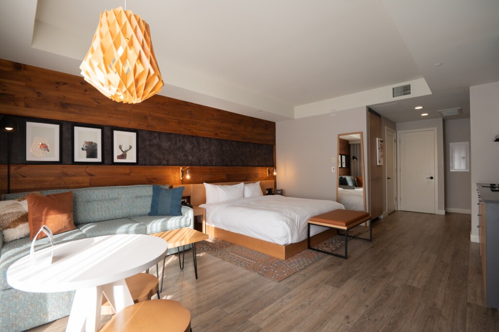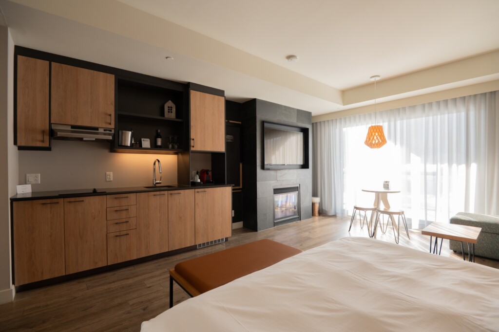 This open-plan, loft-style unit features a king-size bed, a sectional sofa (that converts into a queen-size bed) and a gas fireplace. A kitchenette allows for heating up snacks or light meals. The full bathroom has a glass-enclosed shower, as well as a washer and dryer. The terrace (or balcony) has a small table – the ideal spot for enjoying a morning coffee or an evening cocktail! A loft unit and an urban suite can be combined to create a large, interconnected space.