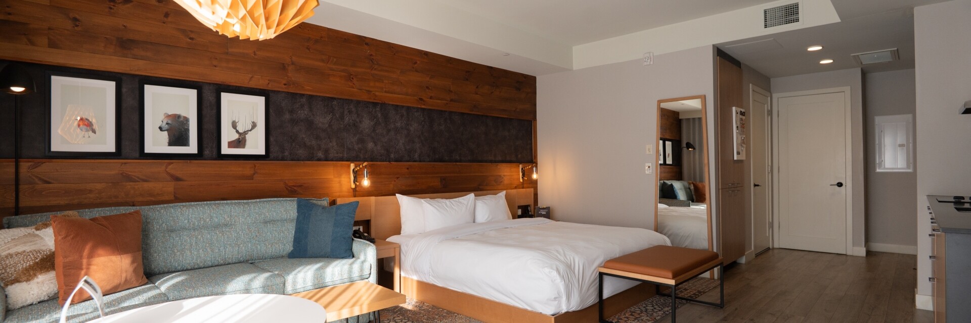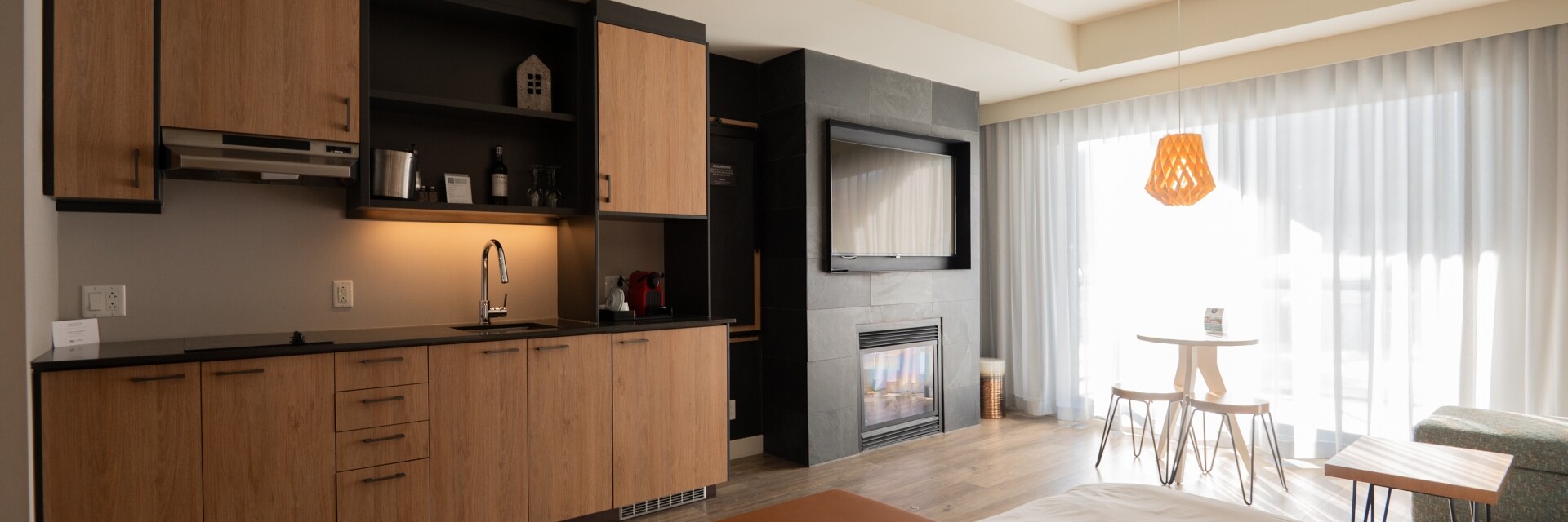 This open-plan, loft-style unit features a king-size bed, a sectional sofa (that converts into a queen-size bed) and a gas fireplace. A kitchenette allows for heating up snacks or light meals. The full bathroom has a glass-enclosed shower, as well as a washer and dryer. The terrace (or balcony) has a small table – the ideal spot for enjoying a morning coffee or an evening cocktail! A loft unit and an urban suite can be combined to create a large, interconnected space.