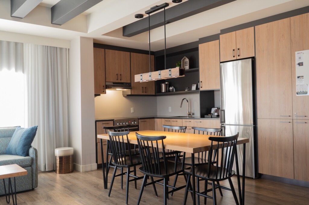 The sectional sofa is in a large living area, along with a gas fireplace. A washer and dryer are also at your disposal. The private terrace (or balcony) has outdoor furniture, providing an additional relaxation and dining area. (These are the only units that feature this extra space.) The Signature suite can be opened up and joined to a Corporate room, creating even more space for a large family, groups of friends or a business meeting.