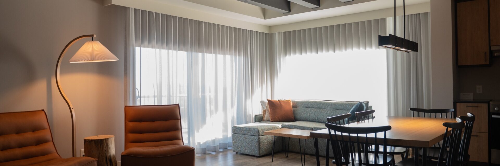 The sectional sofa is in a large living area, along with a gas fireplace. A washer and dryer are also at your disposal. The private terrace (or balcony) has outdoor furniture, providing an additional relaxation and dining area. (These are the only units that feature this extra space.) The Signature suite can be opened up and joined to a Corporate room, creating even more space for a large family, groups of friends or a business meeting.
